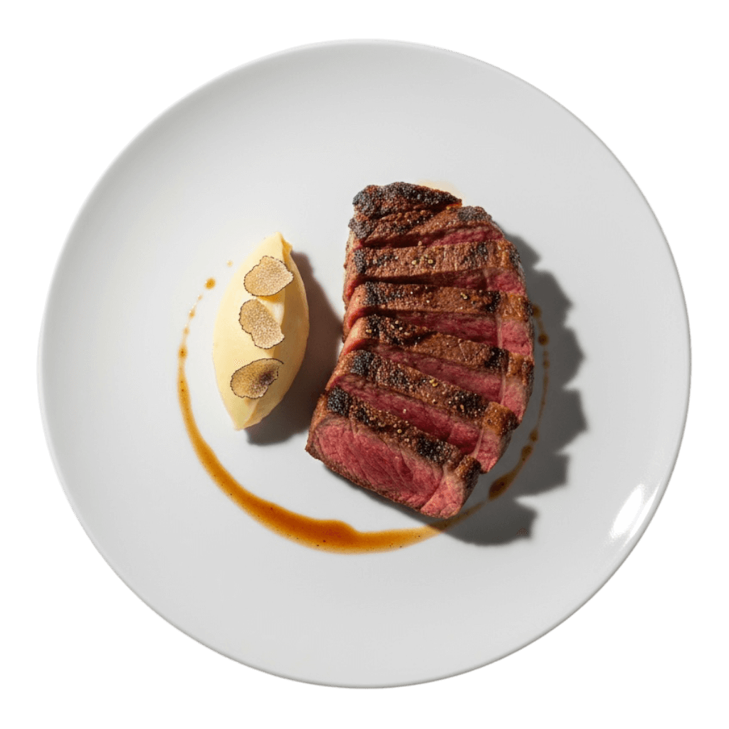 Dressez : purée lisse, tranches rosées, jus brillant laqué.