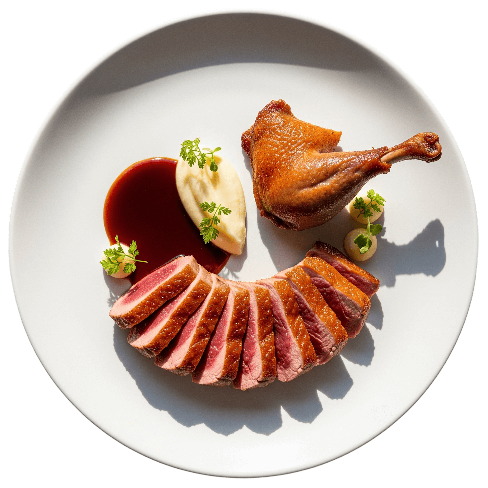 Dressez : purée lisse, tranches rosées, jus brillant laqué.