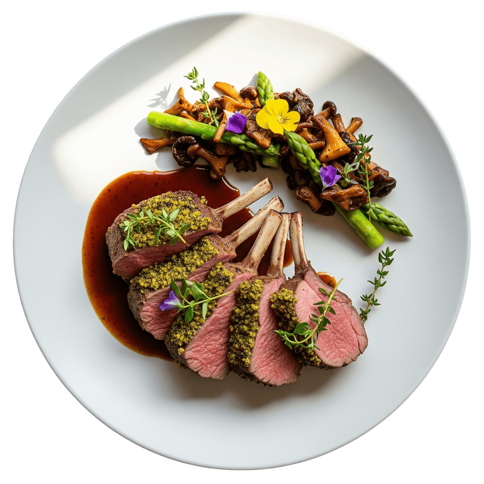 Un carré d'agneau en croûte d'herbes, servi avec une poêlée de champignons de saison.