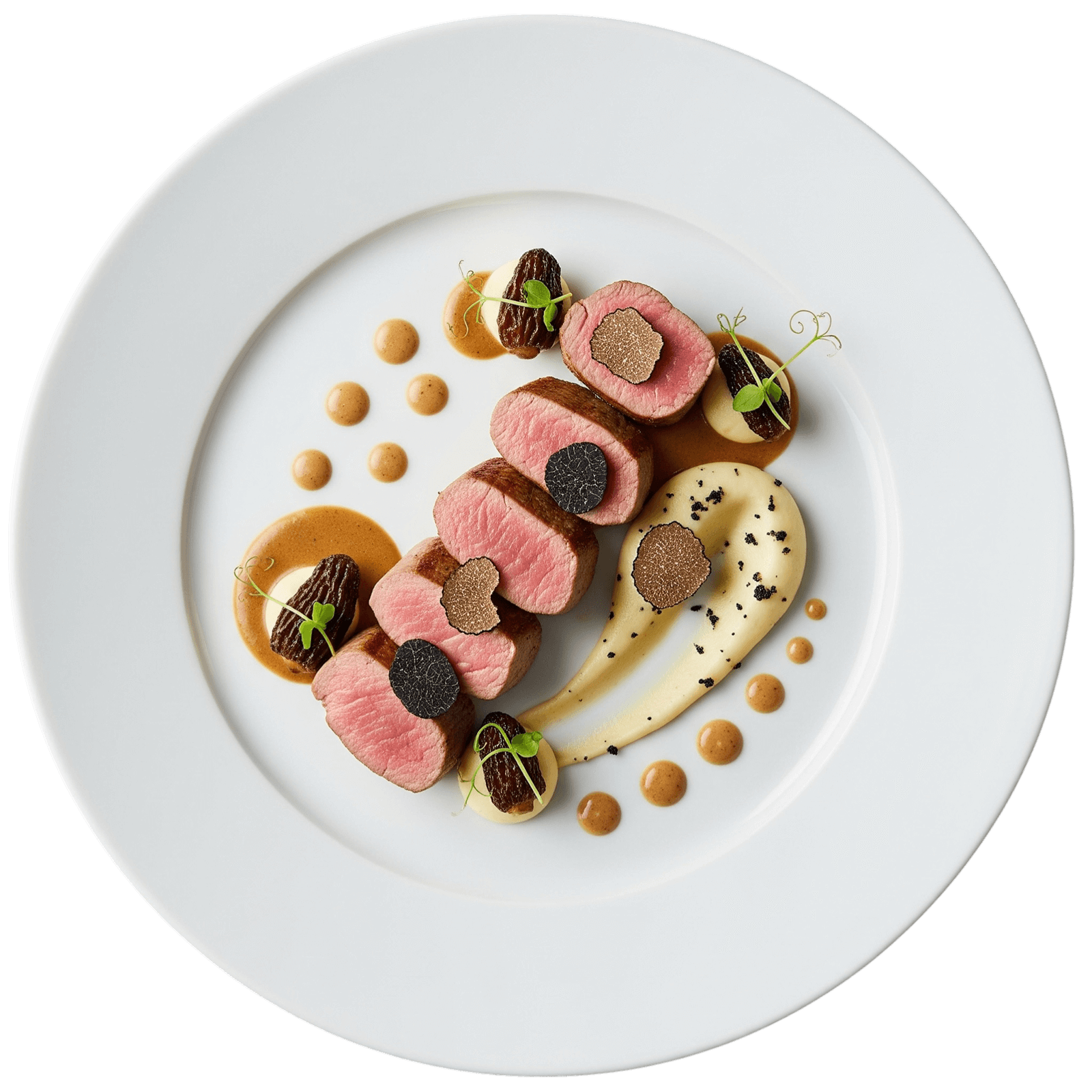 Quasi de veau de lait rosé, cuit à basse température, avec un jus de veau aux truffes.
