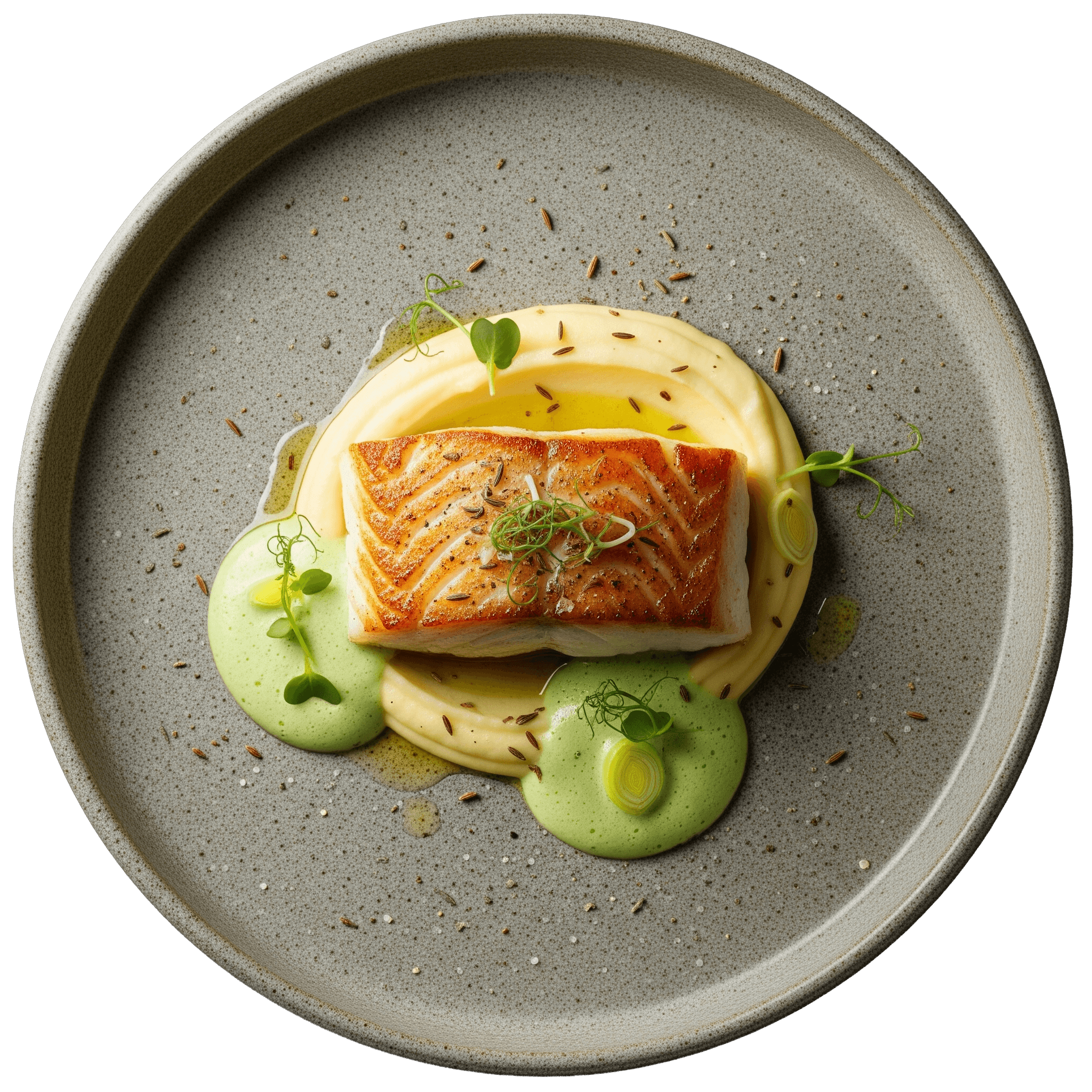 Dos de cabillaud à la crème de pomme de terre, émulsion de poireau et cumin.