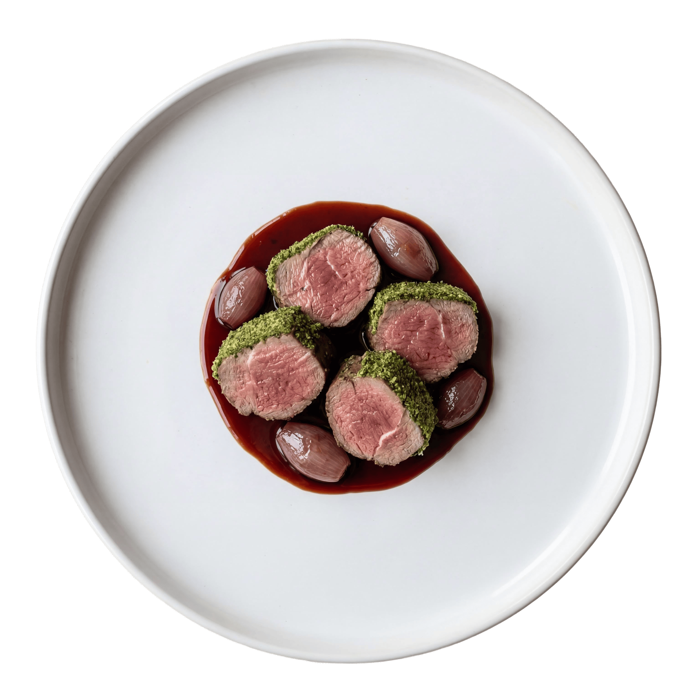 Longe d’agneau en croûte d’herbes, jus au vin rouge réduit et échalotes confites